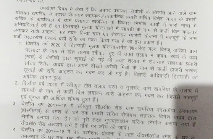 वित्तीय वर्ष 2019 में स्वीकृत खेत तलाब धरम व गुलचंद ग्राम खपरिया के तालाब में सामग्री के नाम से फर्जी बिल लगाकर राशि आहरण की, जिससे मजदूरों एवं कृषक का आर्थिक शोषण हुआ। वित्तीय वर्ष 2017-18 में स्वीकृत सीसी रोड ग्राम खपरिया शासकीय अस्पताल से रमेश के घर तक प्रभारी सचिव रोजगार सहायक दिनेश यादव द्वारा निर्माण कराई गई जो पुरी तरह गुणवत्ताविहिन है। सीसी रोड उखड़ने लगी है।